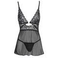 Short babydoll from Cottelli Lingerie made out of stretchy, delicate Powernet. The babydoll has lace cups that are held together by a gold-coloured ring. The strap underneath the breasts and the bra straps join together at the back and are also held together by a gold-coloured ring. The bra straps are adjustable. Includes a classic, Powernet string.